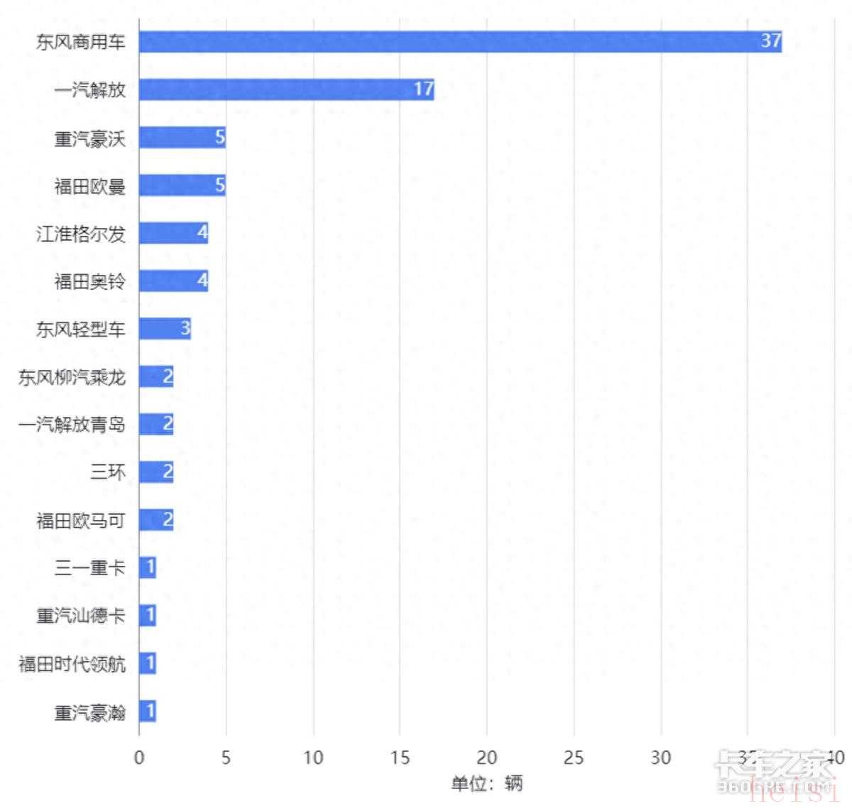 从数据上可以发现,除了前两名之外,其他品牌的占比都不是很高,分布特别不均匀,出现了东风一家独大的情况,即便是排名第二的解放也与其相差甚多,可见东风在本地的受欢迎程度有多高。