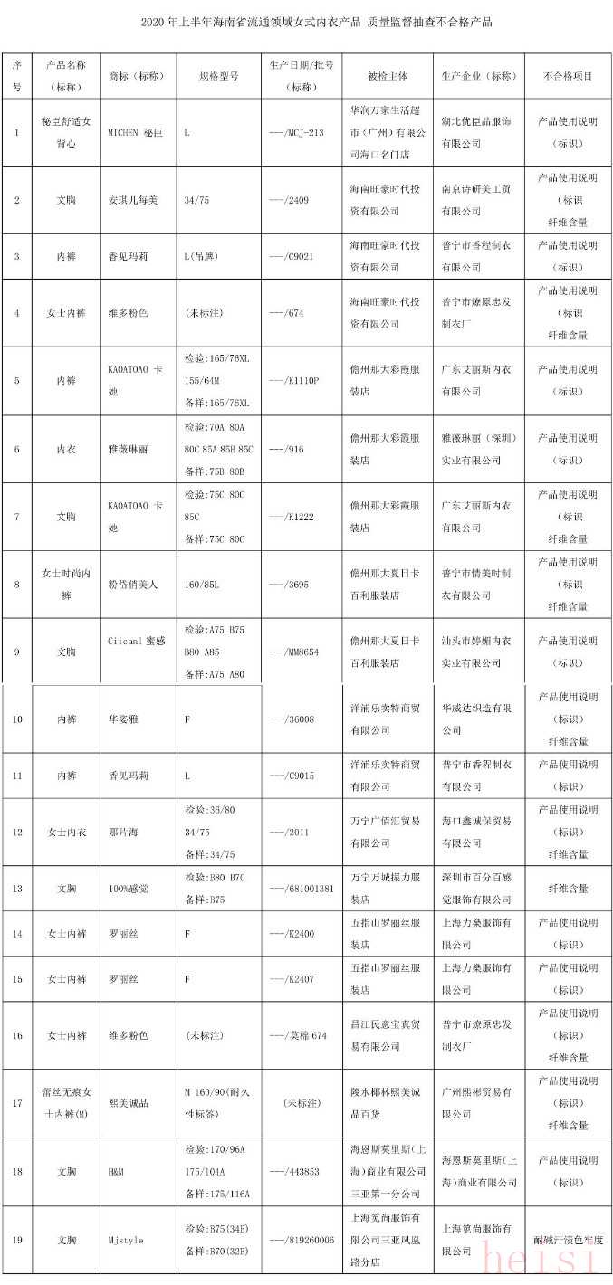 新海南客户端、南海网、南国都市报8月25日消息(记者 蒙健)近期,海南省市场监督管理局对全省流通领域女式内衣产品进行了监督抽查。本次抽查了45批次产品,经检验,不合格19批次,不合格率为42.2%。记者了解到,此次不合格的19批次涉及H&M、熙美诚品、罗丽丝等品牌,涉及的不合格项目主要为使用说明(标识)、纤维含量、耐碱汗渍色牢度。