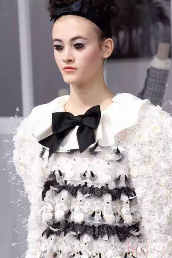 Chanel 2016秋冬高级定制系列,第68套LOOK由Lemari全力打造,用了将近20,000片花瓣以及1,000多颗莱茵石,裙子上加宽的蕾丝装饰着皮革料的人造花瓣以及细小的羽毛。