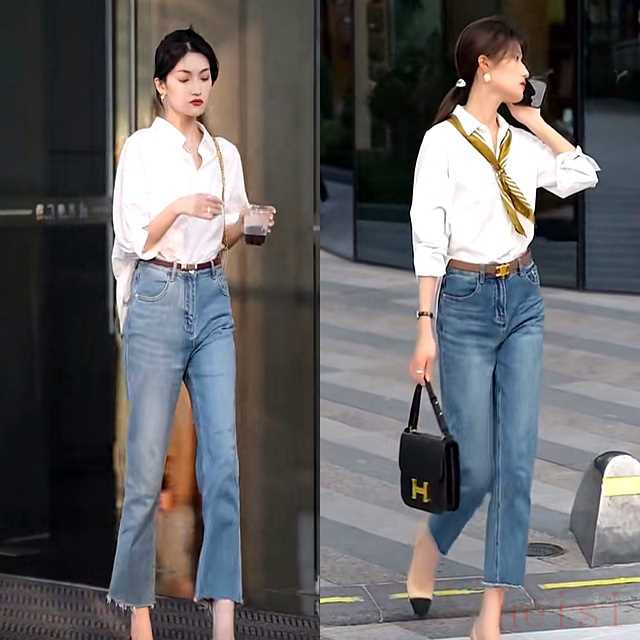 "洋气点:" 选择设计简洁、鞋型利落的小白鞋,比如乐福鞋款、基础款运动鞋或牛津鞋底的白鞋,更能体现高级感。可以尝试不同材质,如麂皮、绒面、或者带有特殊纹理的小白鞋。