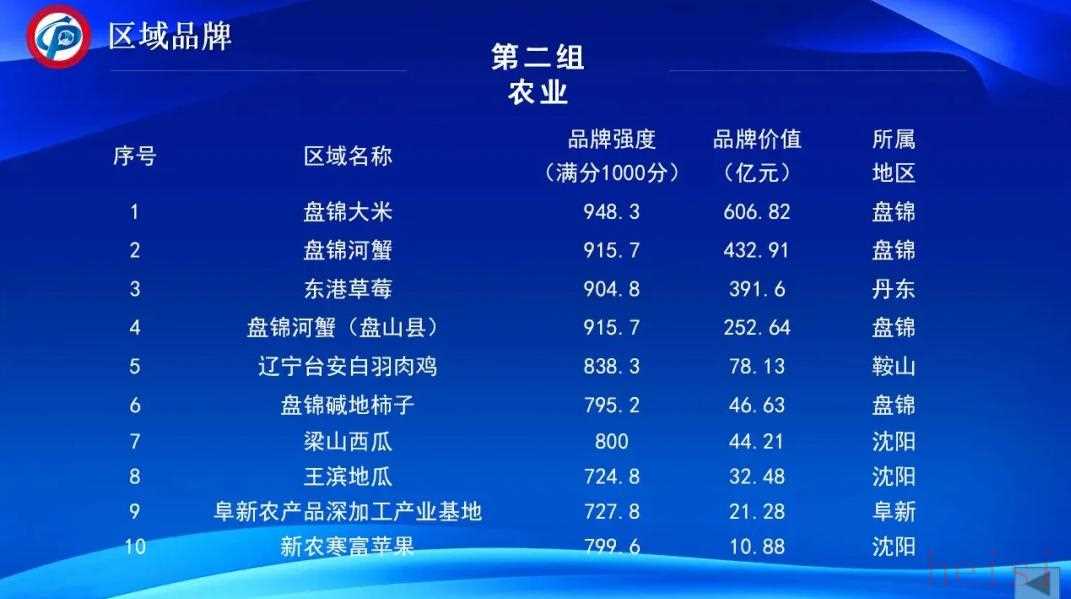 其中盘锦大米最高,品牌价值为606.82亿元。盘锦河蟹,品牌价值432.91亿元。