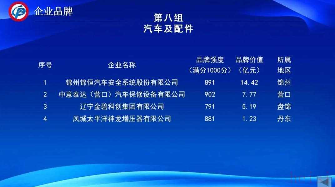 其中锦州锦恒汽车安全系统股份有限公司最高,品牌价值为14.42亿元。