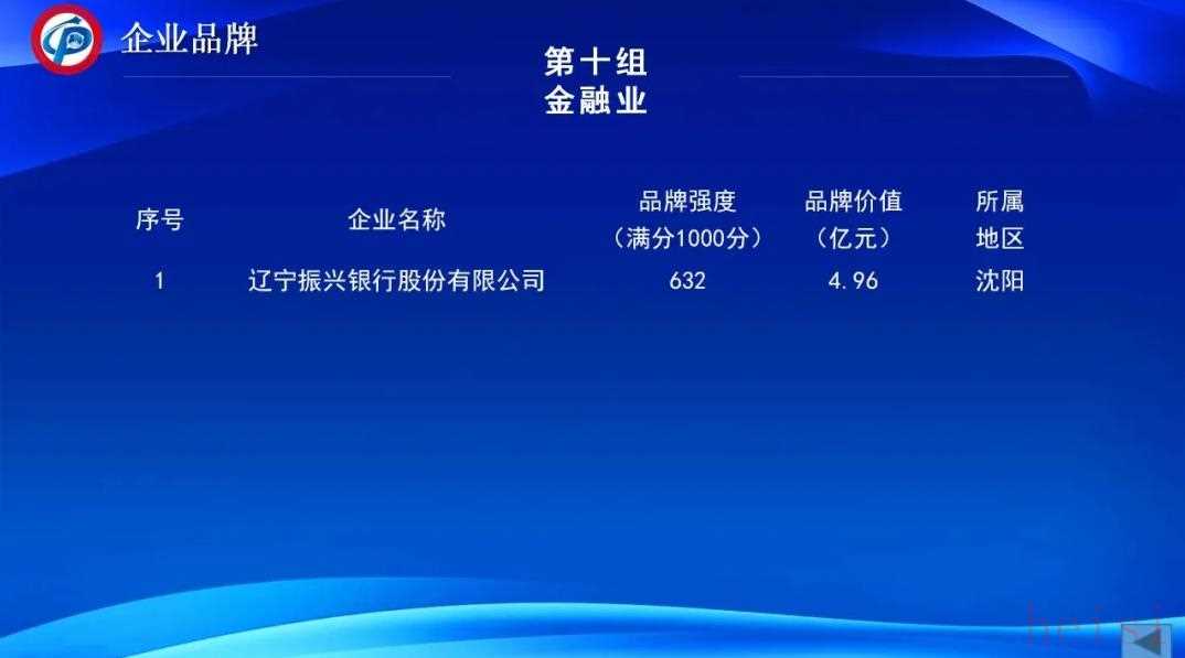 10.金融业参评企业1家,为辽宁振兴银行股份有限公司,品牌价值为4.96亿元。