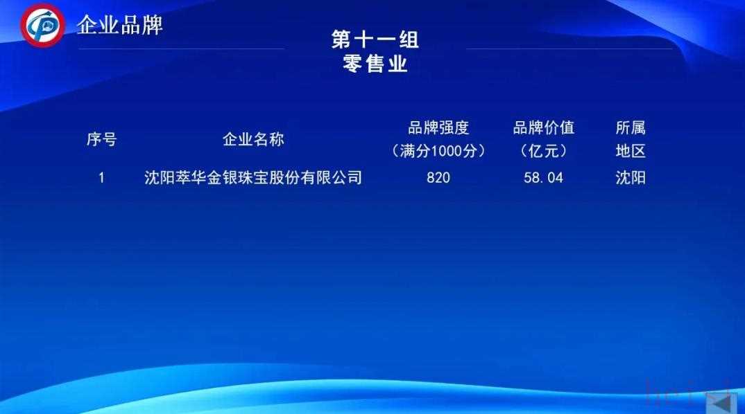 11.零售业参评企业1家,为沈阳萃华金银珠宝股份有限公司,品牌价值为58.04亿元。
