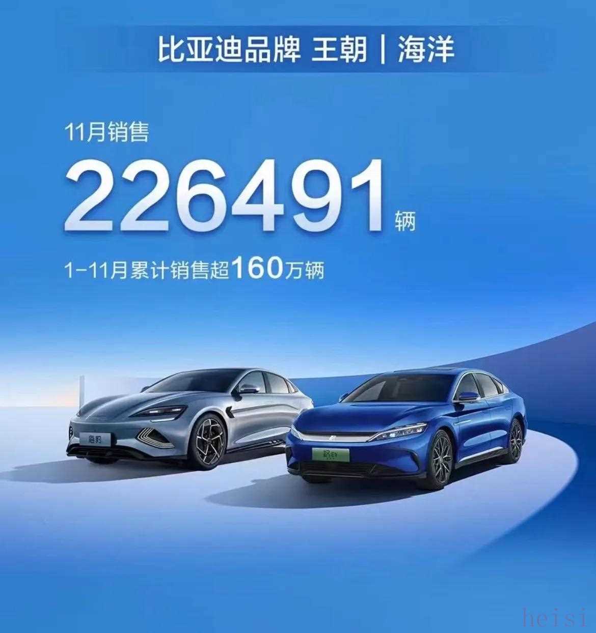 继10月份比亚迪销量创新高后,11月销量高达23.04万辆,同比增长152%,今年前11个月累计销量为162.8万辆,同比增长219%。这样的销量成绩,可谓是将大众、丰田等合资品牌彻底甩开了。