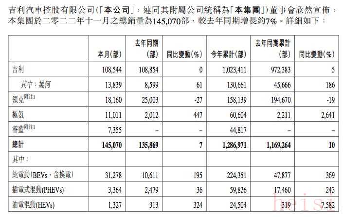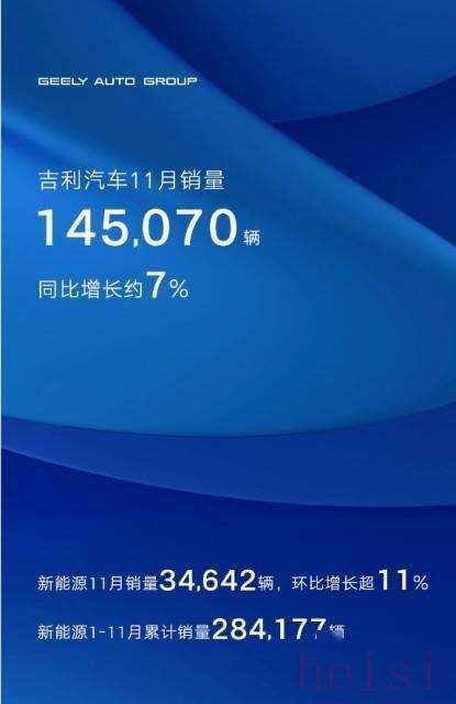 1-11月销量:128.7万辆吉利汽车集团11月共销售145070辆新车,同比增长7%,1-11月累计销量约128.7万辆,同比增长10%。