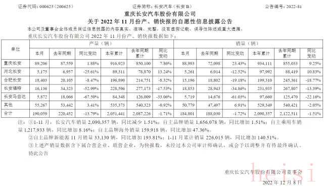 今年1-11 月,长安汽车销量209.04万辆,同比减少 1.51%;自主品牌销量 万辆,同比增加 1.51%;自主乘用车销量万 辆,同比增加8.16%;自主品牌海外销量 15.99万 辆,同比增加 47.36%。其中,自主品牌新能源累计销量 22.6万辆,同比增加 140.51%。