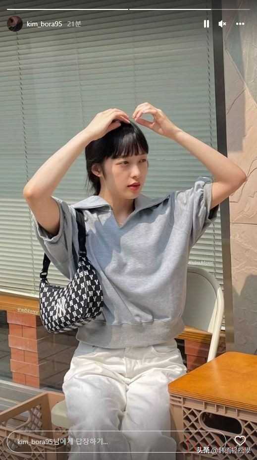 金宝拉的基本款灰色领子运动衫和白色牛仔裤搭配黑色MLB单色流浪汉包,作为点缀包,活灵活现地活用起来非常显眼!