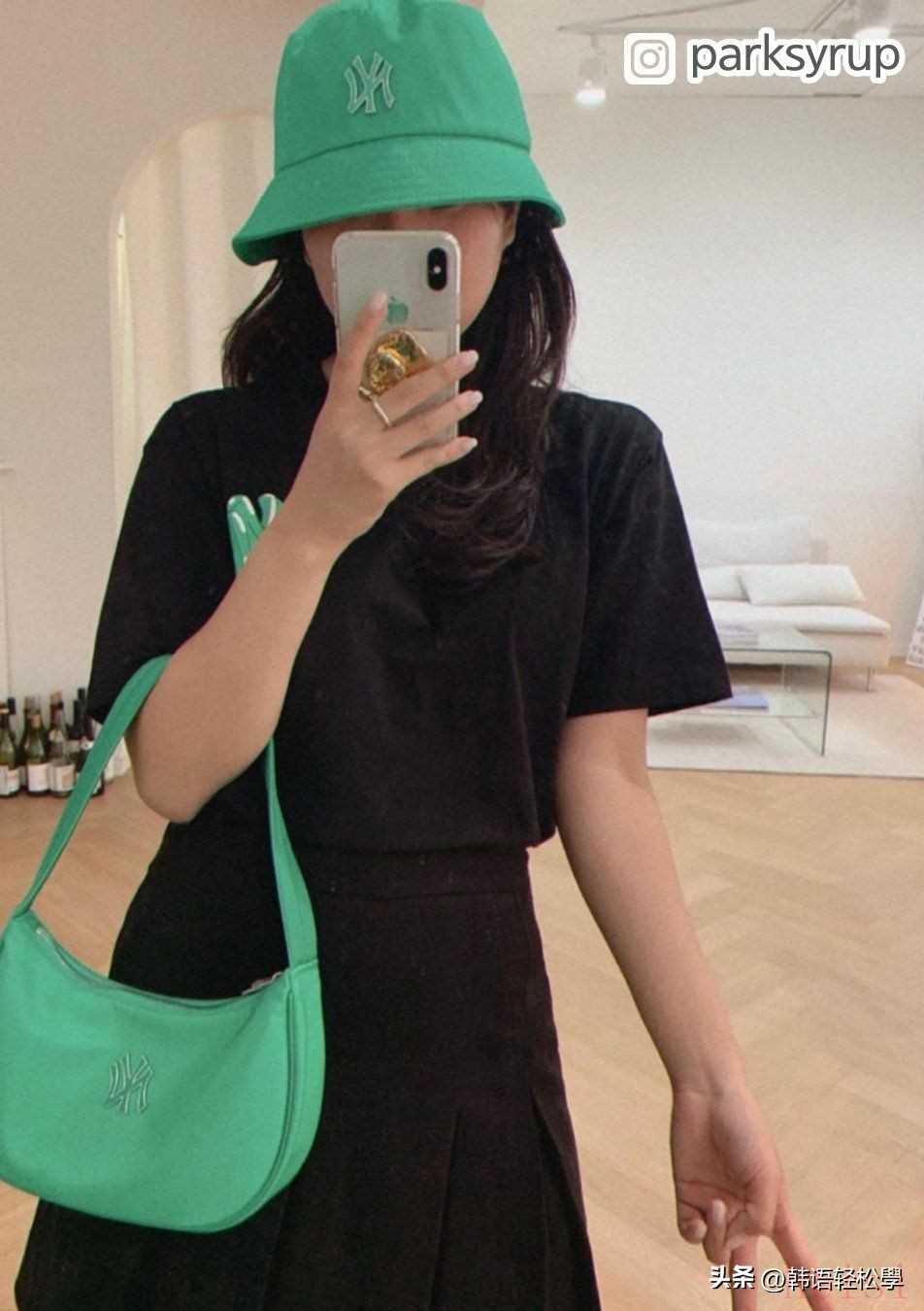 如果说之前一直执着于基本颜色的包包,那么今年夏天选择MLB的绿色包包,展现更加帅气的装扮也不错。