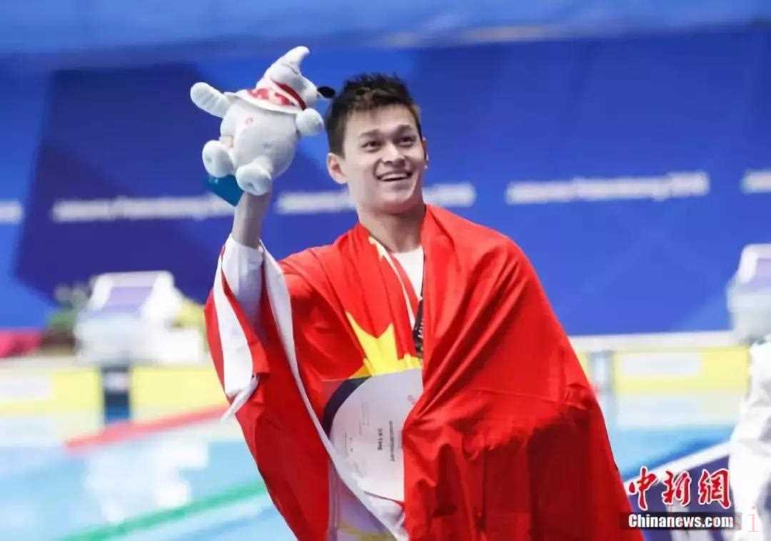 孙杨用国旗挡住了运动服logo。/ 中新网