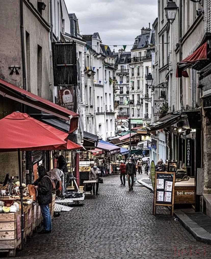 如果你想了解真正的老巴黎,一定不能错过位于左岸拉丁区的穆浮塔街,这是一条从罗马时期就保留下来的老街,有着2000多年的历史。穆浮塔街由北向南一路下坡,街不宽,面积也不算大,但用鹅卵石铺成的这条街现在是吃货的天堂,充满活力又展现平民日常生活氛围的传统市集贩售着各式各样的新鲜水果、醇正奶酪、调味品、甜品、肉类……市集摊位的商贩热情地唤着客人光临,络绎不绝的客人喧闹但又有秩序。