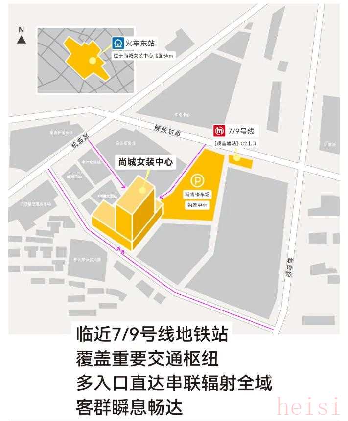 它的附近,有杭派精品服装、新九天女装大厦、中洲女装城、意法服饰城等服装集合体,还临近地铁7、9号线的“观音塘”站。