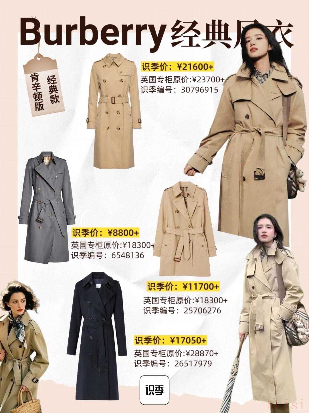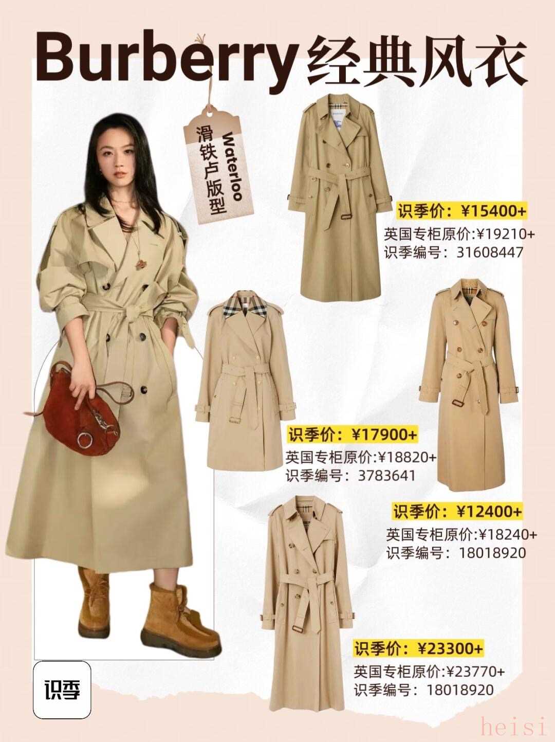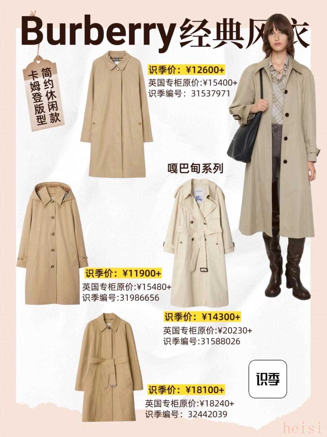 "雨衣 (Trench Coat):" 1914年诞生的巴宝莉雨衣,是品牌历史上最伟大的发明之一。它不仅实用,能够抵御风雨,更以其优雅的剪裁和精致的制作工艺,成为了时尚界的经典单品,被无数名人明星穿着出入各种场合,成为英伦风格的代表之一。