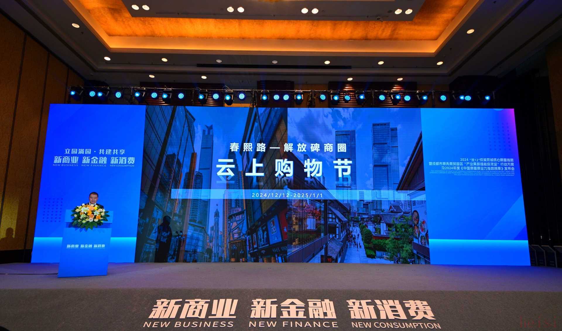 12月12日下午,由商务部驻成都特派办指导,成都市发改委、成都市商务局领办,成都市锦江区人民政府、重庆市渝中区人民政府主办的“新商业、新金融、新消费”2024“双12”成渝双城核心商圈指数暨成都市商务商贸园区“产业集群提能级攻坚”行动方案及2024年度《中国商圈商业力指数榜单》发布会在成都市春熙路商圈举行。
