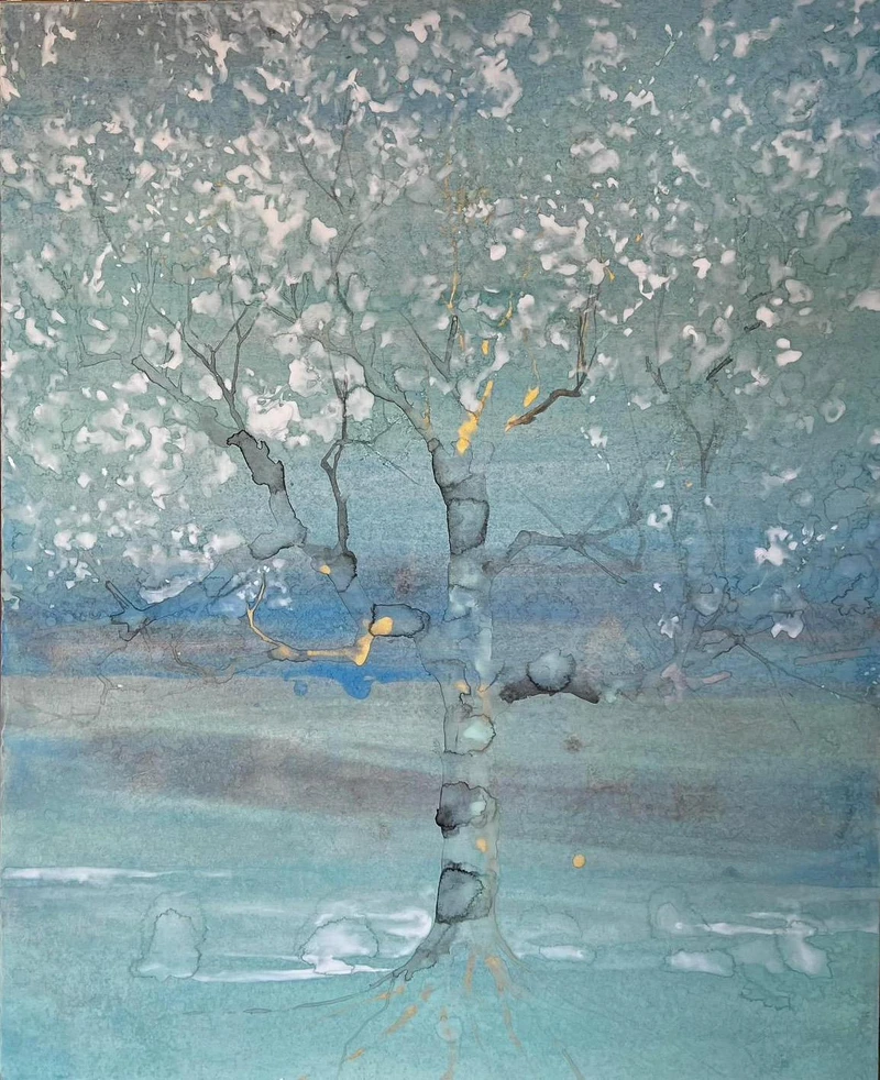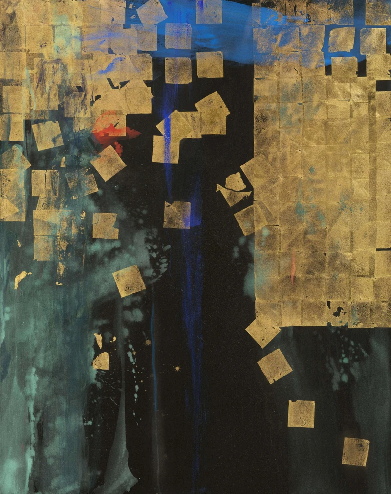 金箔、银箔,白金等矿物材料的使用,会随空气、湿度、光照而产生细緻变化,令作品犹如时光的载体,又因选择颗粒较大的矿物,画面色泽呈现晶莹折射感。藤村真将创作视为一种静默的祈祷与恩典的彰显,藉由画布承载情感与精神经验;他关注破碎、裂缝与沉默的意象,并在其中寻找更新与转化的可能,其对的探寻,也体现在对光的处理上——光并非从画布之外照入,而是从色层深处透出,依循物质自身特性绽放出光泽。