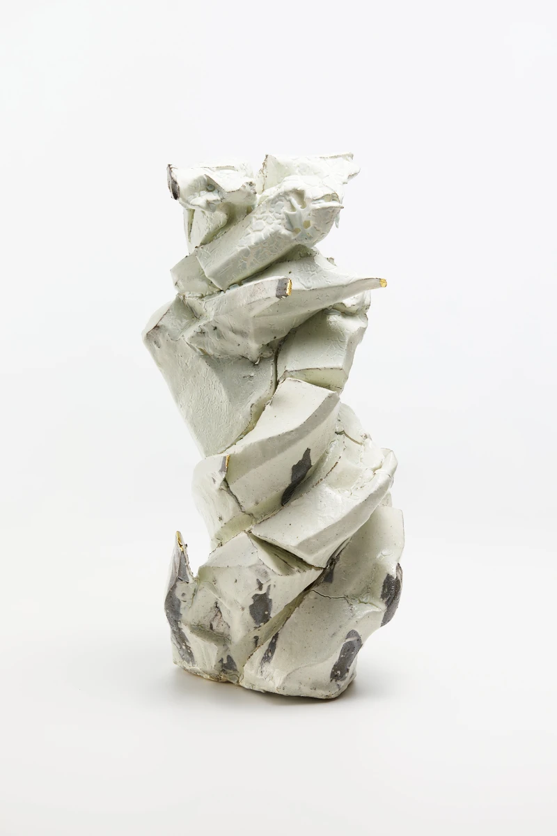 他特别呼应《Dust and Gold 尘与金》的核心意象,于部分作品中融入金和银的元素,金属的光泽如微光般浮现于陶土肌理之上,为自然烧成后的粗砺表面注入一丝灵光的闪现,其所带来的三种创作系列:展现火与灰烬交织的生成、延续他对地壳爆裂与能量释放的直观回应、则透过细緻柔和的肌理,扣连展中对信念与内在光源的探求。在火、土与金属交错间,藉三种形式提出关于转化与承载的可能,亦为本展营造时间压缩后的深刻回音。