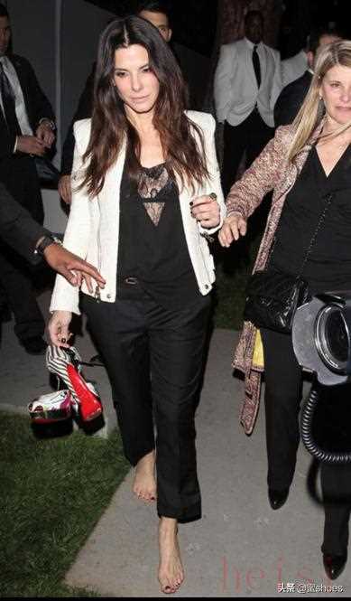 好莱坞老牌明星-56岁的桑德拉·布洛克出席活动,也是斑马纹的厚水台红底鞋,当然也是提在手里的。她饰演的科幻电影《地心引力》和家庭温情片《弱点》到现在都算经典中的经典。