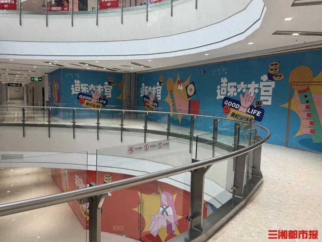 7月1日,五一商圈乐和城,曾经熙攘的正门如今略显冷清,与周边长沙国金中心、平和堂等商业体形成鲜明对比。步入商场,空荡荡的感觉扑面而来,昔日热闹的ZARA、丝芙兰等主力店已人去楼空,仅余GAP、喜茶、鹿岛生活等零星商户仍在正常营业。每层楼的商铺基本为闲置状态,色彩鲜艳的围挡将它们包围,部分围挡的左上角印有“乐和城”字样,仿佛在提醒来往的行人,这里曾经辉煌过。