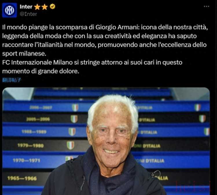 "国米官方悼念阿玛尼:他是我们城市的象征,是时尚界的传奇人物"