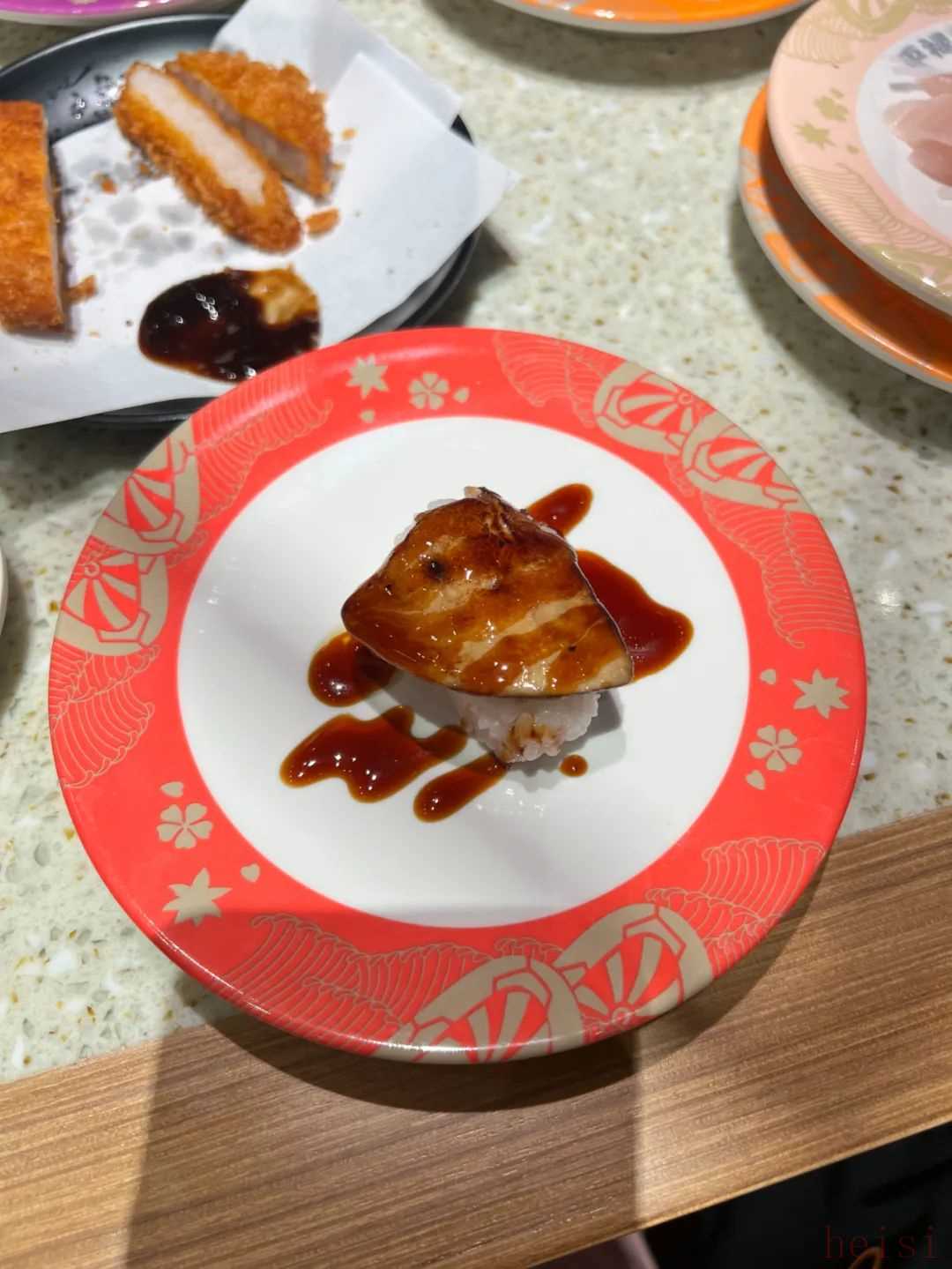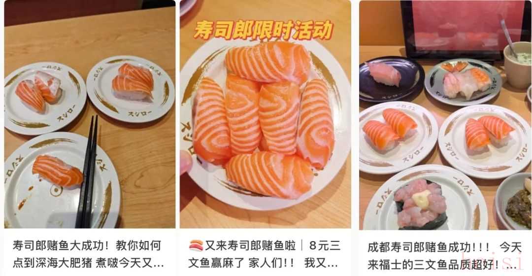 个中顶流要属寿司郎家的三款——8元生三文鱼、10元蓝鳍金枪鱼大腩和8元焦糖鹅肝,分别获封“深海大肥猪”“深海大西瓜”和“焦肝贵妃”,怼脸拍的照片叠加滤镜,一起组成了“郎的诱惑”。活动期间,不少人去了只点优惠款,晒出十几二十个盘子叠在一起的壮观战果;还有人分享出自己的“赌鱼攻略”,先看看传送带上别桌点的三文鱼够不够大块、肥美,再决定下单多少盘。