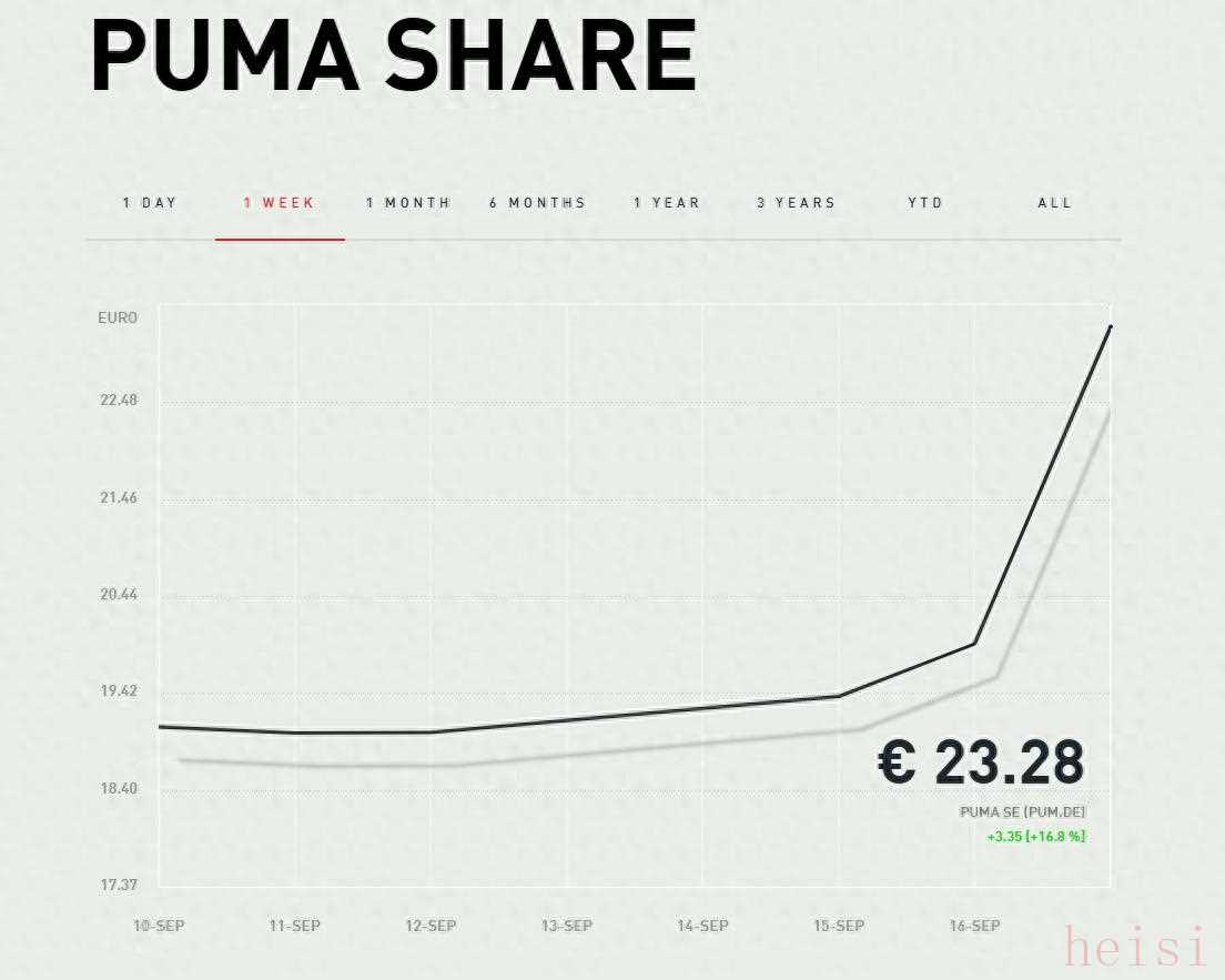 资本市场的反应最为真实。9月16日,受“阿迪达斯或成为彪马潜在收购方”的市场猜测影响,彪马股价应声上涨2.9%,终结多日低迷,17日彪马更是放量大涨16.8%。