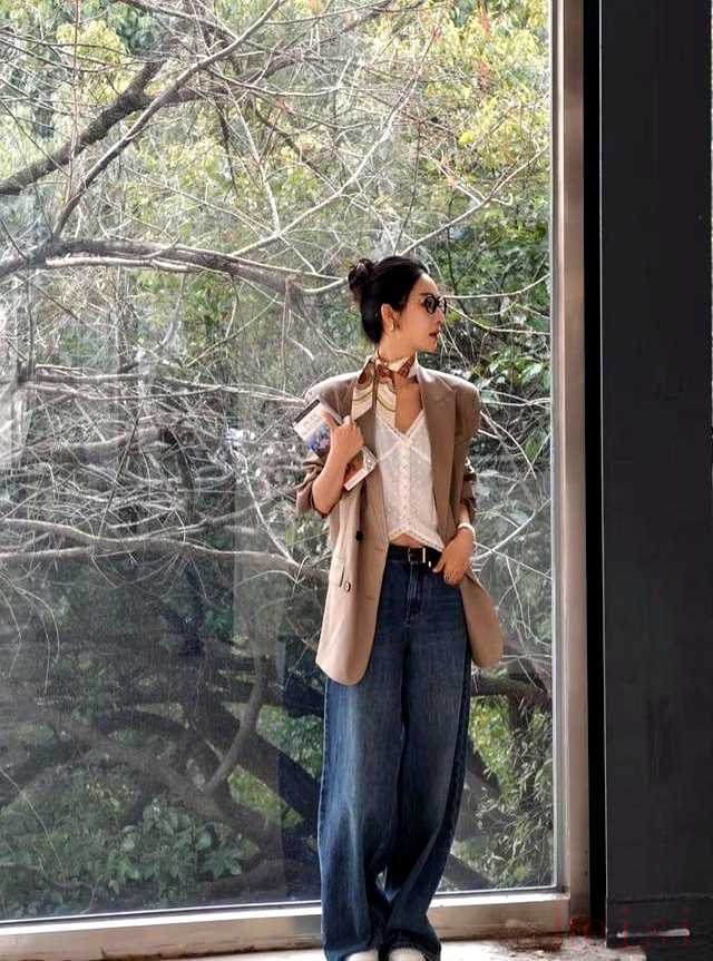 阔腿牛仔是遮肉神器,盖住脚背,只露出鞋头,视觉上把腿拉长。