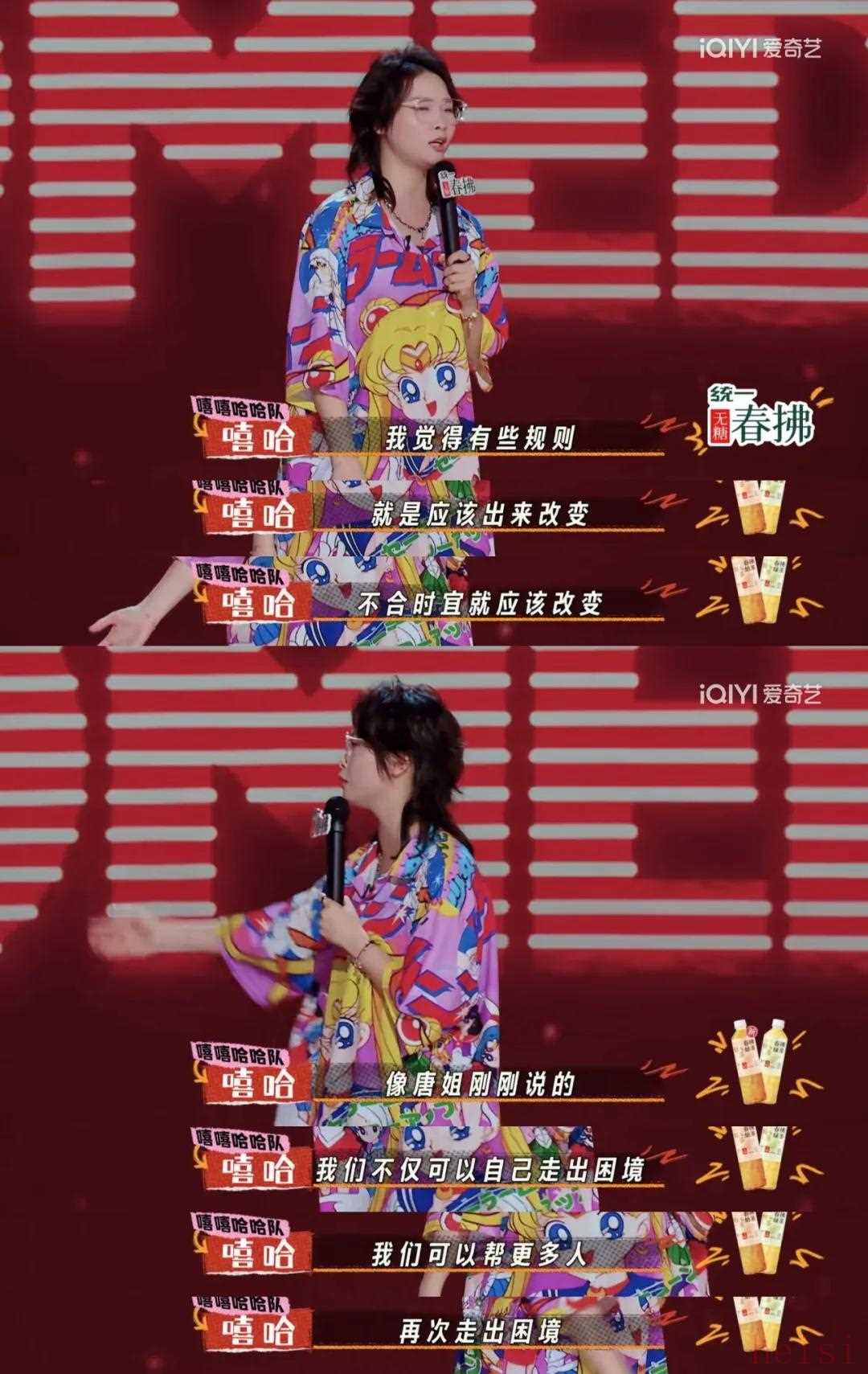 嘻哈从不是传统意义上的赢家。跨界做脱口秀时,她被吐槽“没技巧”;为同事发声时,被前辈刁难不懂规矩;就连这次决赛,她也笑着说“无论输赢,我们都是最棒的单口演员,感谢观众用掌声将我们托举到这里”。但这些不完美恰恰是探索的勋章 —— 就像她在段子里说的:“不合理的规则就该像冷饭一样,端走重新热,热不好就再热,热馊了就扔。”