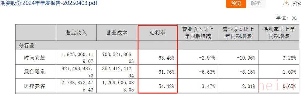 且据今年4月份公司交流纪要,2024年该公司医疗美容业务板块实现营收约27.84亿元,同比增长仅3.47%。且毛利率是当下三条业务线中最低的存在,2024年度医美业务毛利率为54.42%,不及女装业务的63.45%,亦不及婴童业务的61.76%。