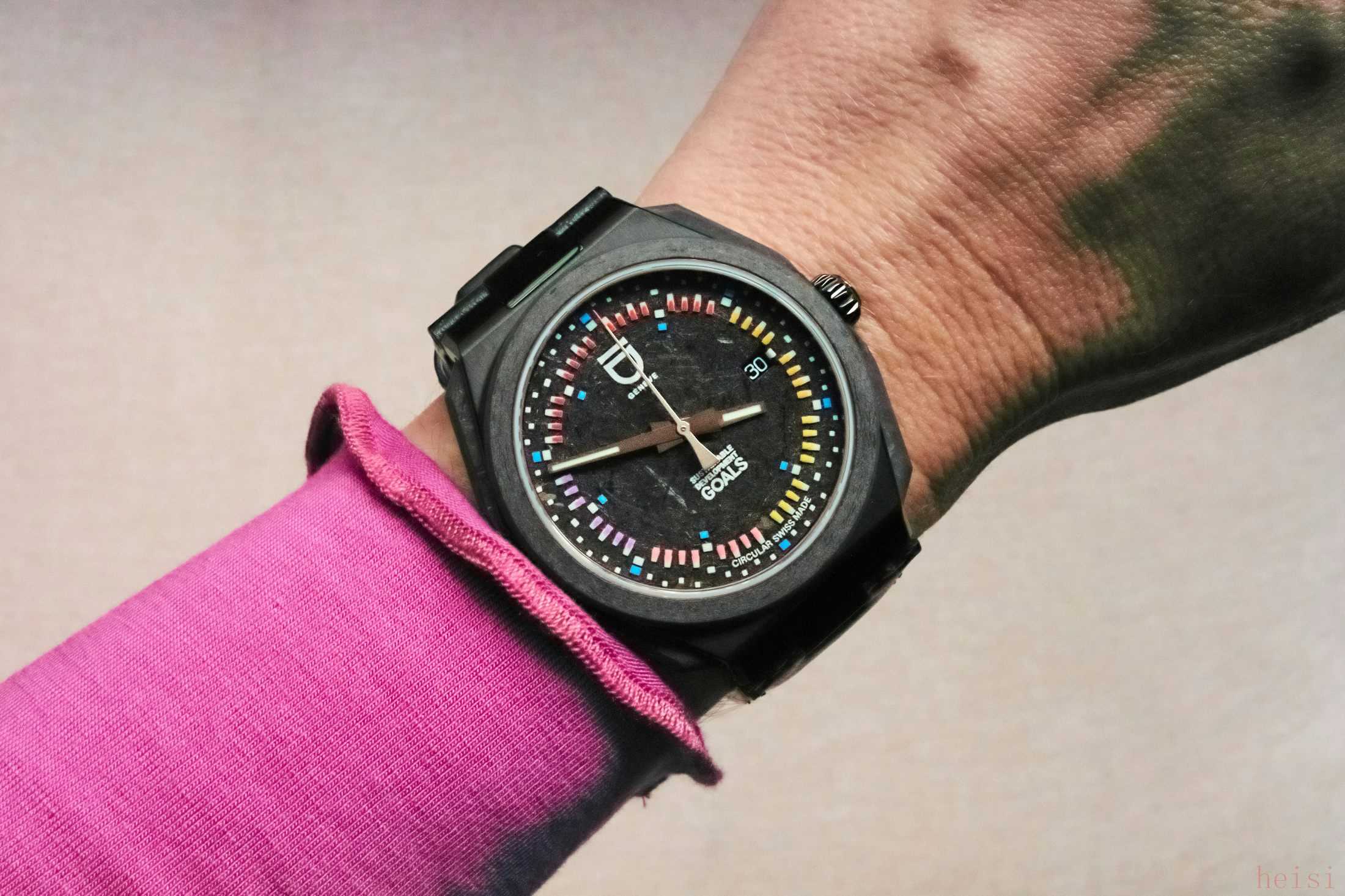 可再生碳纤维表盘保持了其自然外观,遍布细微斑点,赋予腕表柔和而非全黑生硬的外观。如果你了解我和我的个人风格,我是个自称的"彩虹女孩"。因此,对17个可持续发展目标的诠释——以彩虹般的色调环绕在表盘外围并贯穿小时时标——正合我的口味。将腕表翻转过来,展露式表背同样设有一个全彩色的色轮,以庆祝可持续发展目标,并让人得以一窥其搭载的伊塔机芯,该机芯采购自历史库存并经过全面检修。