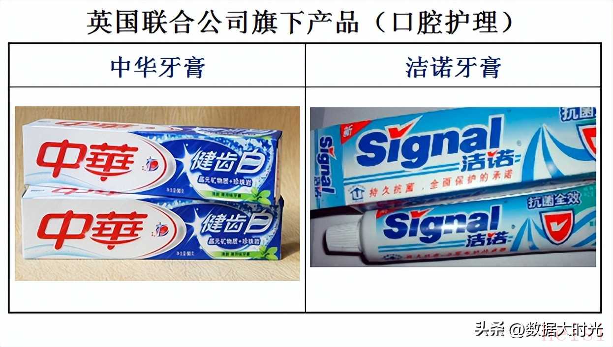 在口腔护理领域,英国联合利华公司旗下产品主要有:中华牙膏,洁诺牙膏。