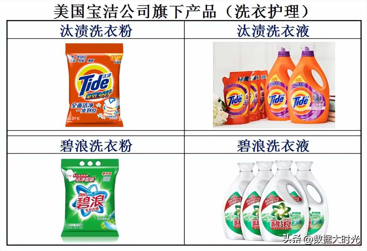 在洗衣护理用品领域,美国宝洁公司旗下产品主要有:汰渍洗衣粉、汰渍洗衣液、碧浪洗衣粉、碧浪洗衣液等。
