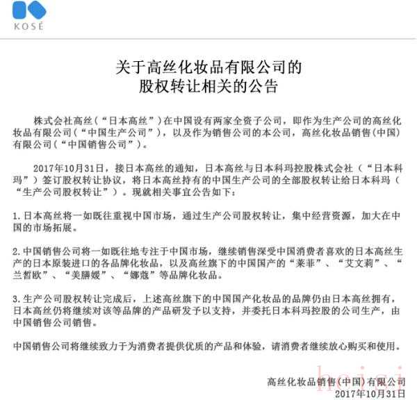 2017年10月31日,高丝中国在其官网发布公告,将日本高丝持有的中国生产公司的全部股权转让给知名化妆品受托制造(ODM)公司——日本科玛控股株式会社(日本科玛,Kolmar Co., Ltd.)。