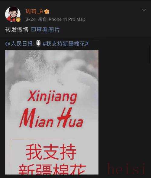 24日,新疆男篮球员周琦转发《人民日报》微博,支持新疆棉花。