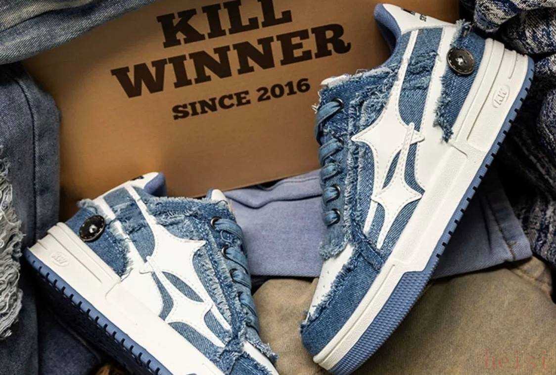 这款板鞋的鞋面是由大面积牛仔布和皮革层叠拼接打造而成。经过水洗工艺处理的牛仔布,配合多层毛边设计,显得立体挺拔且富有层次感。鞋侧的流星状皮革十分亮眼,能吸引他人目光,还提升了鞋面的质感。鞋底运用了多种科技材料,比普通板鞋穿着起来更为舒适,其厚度还具备增高、显瘦以及拉长腿部线条的效果。