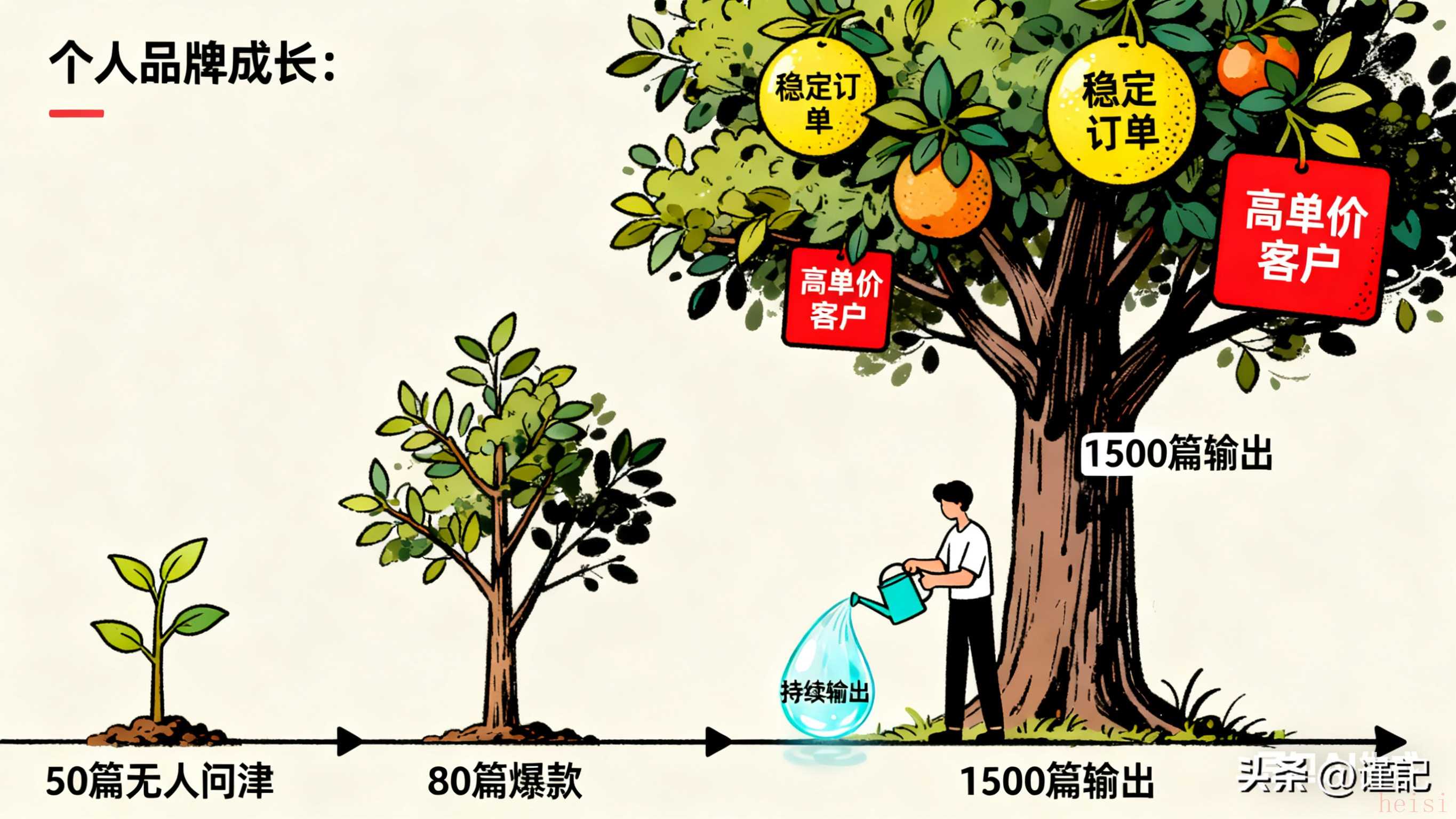 最后也是最关键的一点:一直写,熬出自己的品牌。很多人做 IP 半途而废,就是因为觉得 “写了几十篇没效果”。但个人品牌的成长,就像种树,得等时间。我刚开始写内容的时候,前 50 篇几乎没人看,直到第 80 篇《电商文案怎么写,能让客户再下单》突然火了,才有客户主动联系我。现在我在各个平台写的总篇数已经超过 1500 篇,每天都有稳定的单子找过来。记住,不是写一两百篇就够了,至少得坚持写一千篇以上 —— 你写的文字在网上传得越广,认识你的人越多,你的 “品牌价值” 自然就上去了。