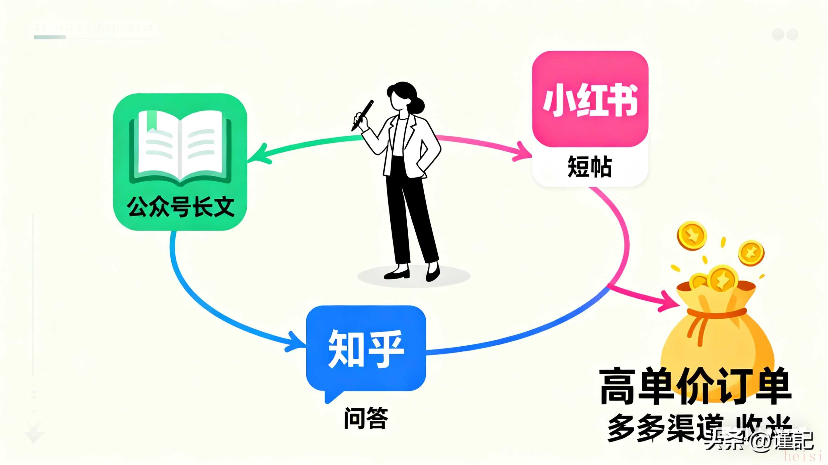 还有,得搭个内容矩阵,别把鸡蛋放一个篮子里。不同平台的用户需求不一样,比如公众号适合写深度干货,小红书适合短平快的技巧,知乎适合解答行业问题。你可以根据平台的特点调整内容形式:在公众号写《万字拆解:怎么写出能带货的电商文案》,到了小红书就改成《3 步找产品卖点,新手也能会》,在知乎就《自由撰稿人怎么接高单价单子?》。这样既能覆盖更多人,也能避免一个平台流量不行了,影响接单子。我现在每天花 1 小时整理内容:把公众号的长文拆成小红书的短帖子,把知乎的扩写成公众号文章,既能保证更文量,又能省时间。