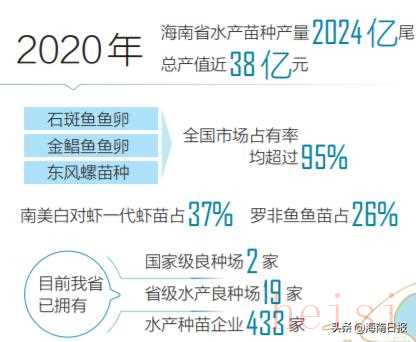 一批竞争力较强的企业和品种正在涌现。目前,我省已拥有国家级良种场2家、省级水产良种场19家、水产种苗企业433家,主要分布在文昌、琼海、陵水、东方、临高等市县。