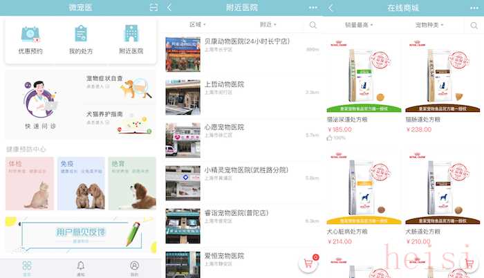 从目前发布的版本来看,微宠医App主要有快速问诊、预约服务、在线商城以及健康提醒四个功能。线上,宠物主可以向宠物专家咨询、获取科学养宠知识,预约就近的宠物体检、免疫、绝育等专业服务;进入处方宠医商城,宠物主可以根据医生开具的电子处方,购买皇家处方粮。目前,App上可查询到北京、上海、宁波、苏州等23个城市的部分宠物医院。