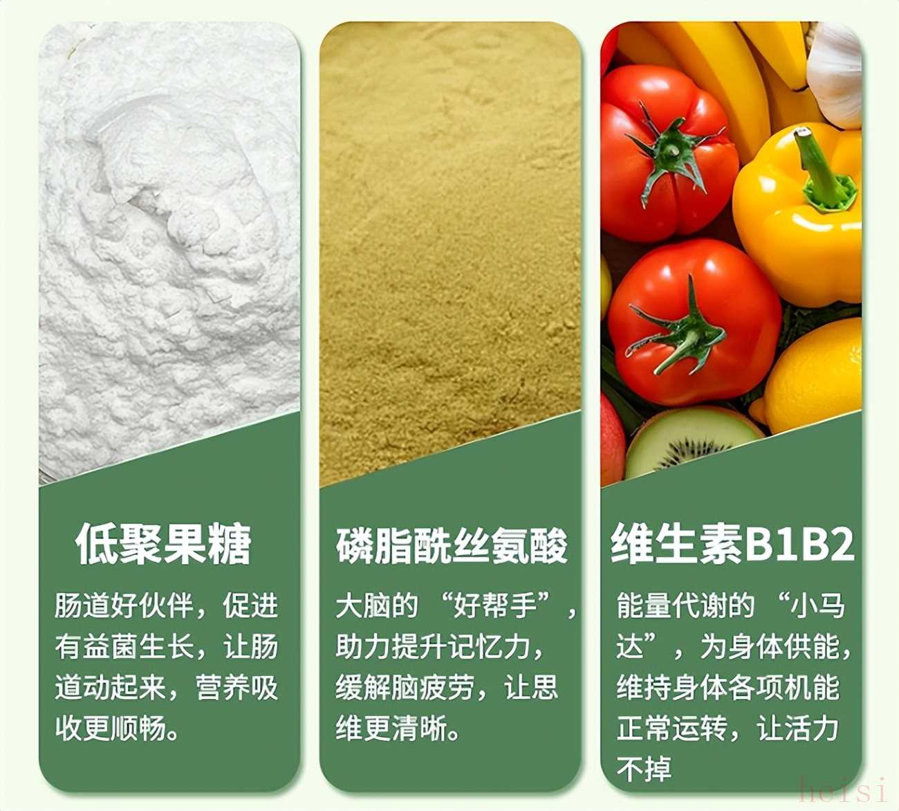 丰富的低聚果糖为肠道益生菌持续供应“口粮”,可以促进益生菌增殖,为肠道“清道夫”续动力,在饮食结构不均衡的当下非常匹配家庭所需。磷脂酰丝氨酸则针对脑疲劳和专注力不足问题,助力大脑轻松“减负”,在学生、职场人士中都表现突出。维生素B1、B2贯穿于能量代谢,为运动、工作或长时间用脑提供稳定支持,维持神经系统的正常运作。