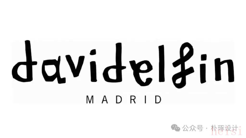 12. Davidelfin(大卫艾尔芬)在 logo 设计中融入个人表达的案例并不少见,但西班牙时装设计师 David Delfín 为同名品牌设计的 logo,却将 “个人符号与品牌精神” 的融合推向了新高度。品牌名称中 “Delfín” 在西班牙语意为 “海豚”,而海豚 “从陆地生物进化为海洋生物” 的特性,正是 David 自身 “从传统设计到自由创作” 的创意进化历程的隐喻。logo 由 David 用左手亲笔书写而成,刻意保留了 “不完美感”—— 线条的轻微倾斜、笔画的自然粗细变化,没有经过工业设计的 “修正”,却传递出 “蜕变” 与 “纯粹” 的品牌气质。它没有精致的图形装饰,仅通过手写字体的原始感,建立起与消费者的情感连接:仿佛设计师的亲笔签名,带着个人化的温度,又与品牌 “注重个性、拒绝同质化” 的时装定位高度契合。这种 “拒绝标准化、拥抱个人特质” 的设计,让它在时尚品牌标识中独树一帜,成为 “设计师品牌视觉表达” 的独特案例。