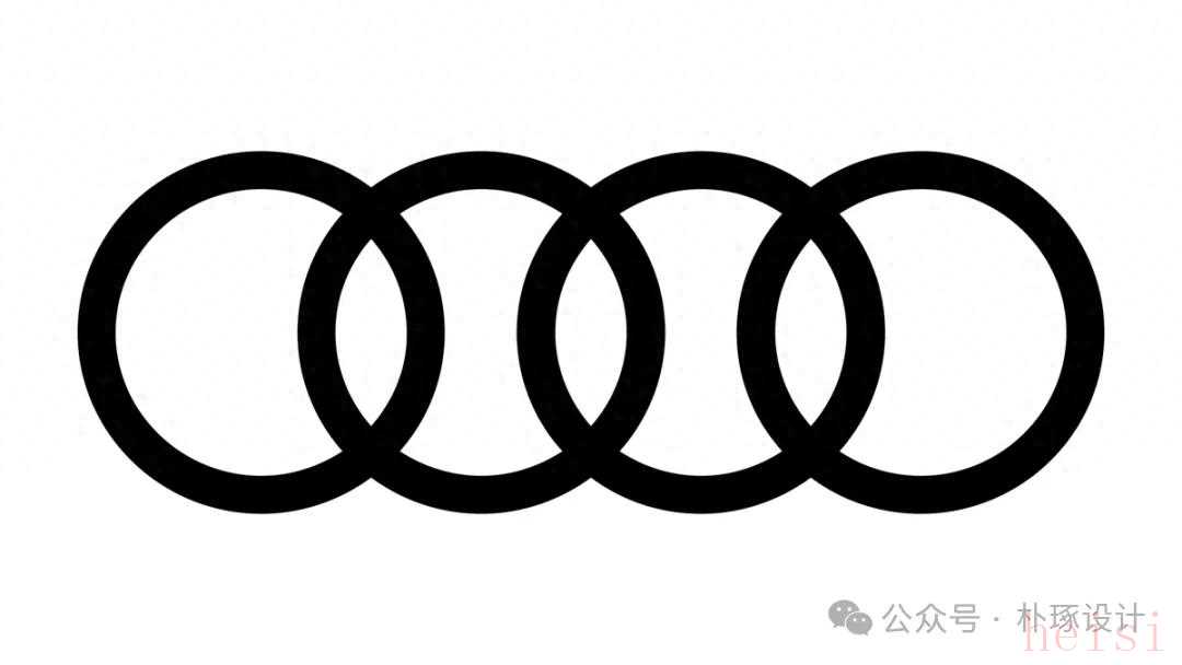 1. Audi(奥迪)奥迪的四个交错圆环 logo,从 “企业联合的象征” 逐步升华为 “卓越工程技术” 的代名词,完美诠释了 “符号的进化力”。1932 年,奥迪与霍希、漫游者、DKW 四家汽车公司合并,四个圆环分别代表四家创始企业,象征 “协同合作、资源整合”;如今,随着品牌发展,它已脱离具体的 “企业联合” 语境,成为 “精准、奢华、工程卓越” 的直观视觉符号。设计的精妙之处在于 “极简中的平衡感”:四个等大的圆形以 25° 角交错排列,线条粗细均匀,既无多余装饰,又能通过 “交错” 形态传递 “联结、可靠” 的核心价值。无论应用于汽车前脸的金属标识、宣传物料的平面设计,还是数字界面的图标,四个圆环始终具备清晰的识别性 —— 它不依赖文字解释,仅通过几何形态,就能让消费者瞬间联想到奥迪的高端定位与技术实力。这种 “符号意义随品牌成长而升级” 的特质,让它成为百年品牌视觉传承的典范。