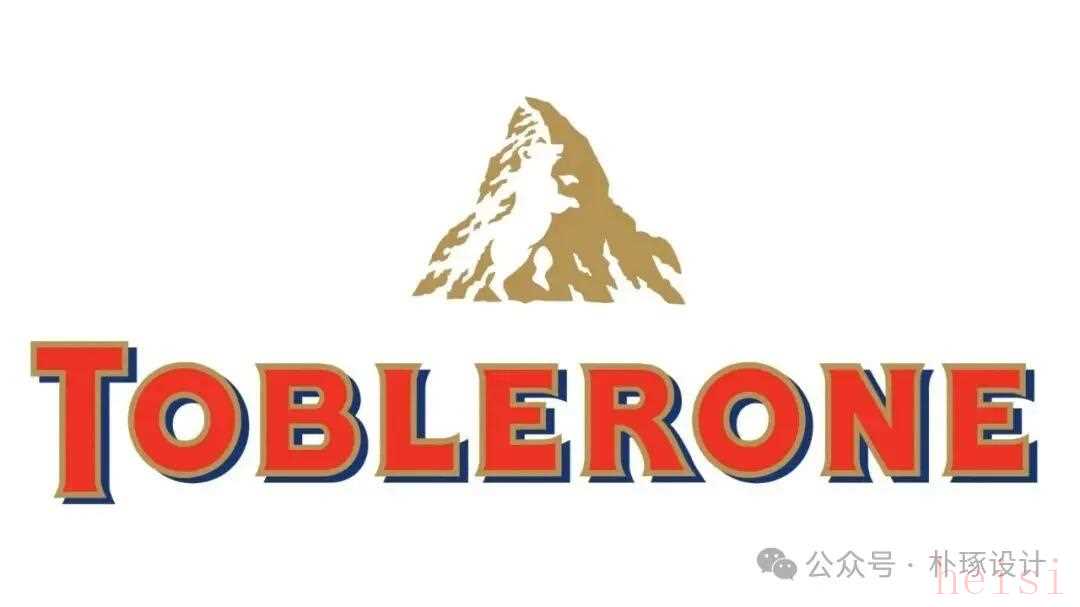 26. Toblerone(三角巧克力)三角巧克力的 logo,是 “负空间运用” 与 “地域文化融合” 的经典案例,将 “产品特性、地域根源与趣味彩蛋” 完美融为一体,成为食品行业标识设计的标杆。logo 的核心视觉是 “瑞士阿尔卑斯山的马特洪峰(Matterhorn)” 山脉图案 —— 三角巧克力的产地为瑞士,马特洪峰是瑞士最具代表性的地理符号,山脉的三角形态又与巧克力的 “三角柱” 产品造型高度契合,既传递出 “产地正宗” 的信息,又强化了产品的独特形态记忆。