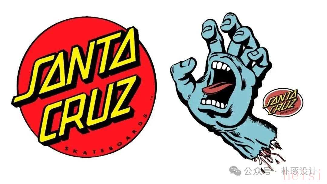 31. Santa Cruz(圣克鲁斯滑板)圣克鲁斯的滑板 logo,是 “捕捉亚文化精髓” 的设计典范,比其他任何符号都更精准地传递出 “叛逆青年文化” 的活力与粗粝感。1985 年设计之初,它就摒弃了主流品牌的 “精致化” 思路,采用大胆的字体与高饱和度色彩:品牌名称 “Santa Cruz” 以粗犷的无衬线字体呈现,字母边缘略带毛糙感,搭配亮蓝、明黄、大红等鲜艳颜色,既传递出滑板运动的 “自由、不羁”,又暗合街头文化的 “个性、反抗” 精神。由 Jim Phillips 设计的 “圣克鲁斯尖叫之手(Screaming Hand)”logo,更成为品牌的另一核心符号:手掌张开,手指弯曲,掌心带有 “尖叫” 的表情图案,以夸张的图形语言诠释了 “纯粹的叛逆能量”—— 大胆、鲜艳、过目难忘,完全契合滑板文化 “原始、未经修饰” 的精神内核。在滑板领域,这个 logo 的影响力不亚于科技界的苹果:它不仅是品牌标识,更是 “亚文化身份” 的象征,滑板爱好者通过它表达对主流规则的反抗,证明好的 logo 能成为亚文化群体的 “精神旗帜”。