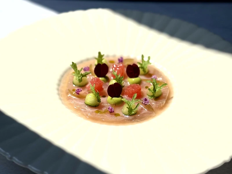 主厨以家乡澎湖的夜色为灵感,将秋冬迴游的红甘鱼轻腌轻炙,搭配葡萄柚与茉莉花茶昆布酱,营造清爽酸韵,再结合酪梨酱、小黄瓜与宝来脆梅,平衡红甘鱼的丰腴,最后使用上紫苏花与山葵叶当点缀,宛如月光在海面上粼粼闪耀。