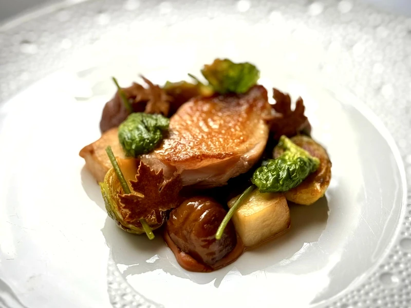 以六龟鹌鹑为主角,经陈年茶叶烟燻后散发木质温润气息,配上牛肝菌肉汁与帕米加诺栗子泥,风味层次深厚。搭配舞菇、孢子甘蓝、水莲与栗子,点缀迷迭香油,让盘面如同秋日林地,落叶与禽鸟的意象栩栩如生。