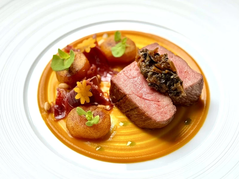 经21日乾式熟成的纽约客牛排,细腻软嫩、香气深厚,再搭配陈皮、酸豆与鯷鱼带出柑橘辛香与鹹鲜层次,还有台南官田菱角泥、爽脆竹笋与腰果提味,再淋上洛神波特酒酱,酸甜优雅,余韵悠长。
