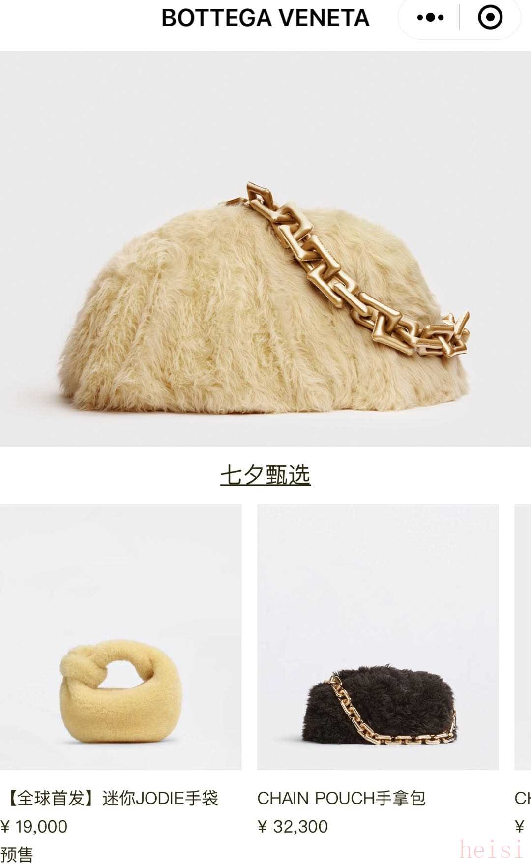 葆蝶家Bottega Veneta就趁着七夕推出了热门手袋的新款——羊毛质地的迷你JODIE手袋,并选择在微信小程序上进行全球首发。与此同时,在七夕甄选系列中还有羊毛版的CHAIN POUCH手拿包。