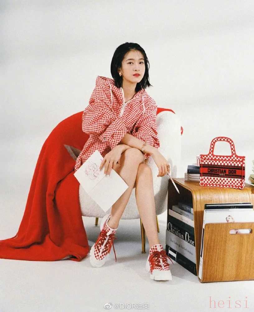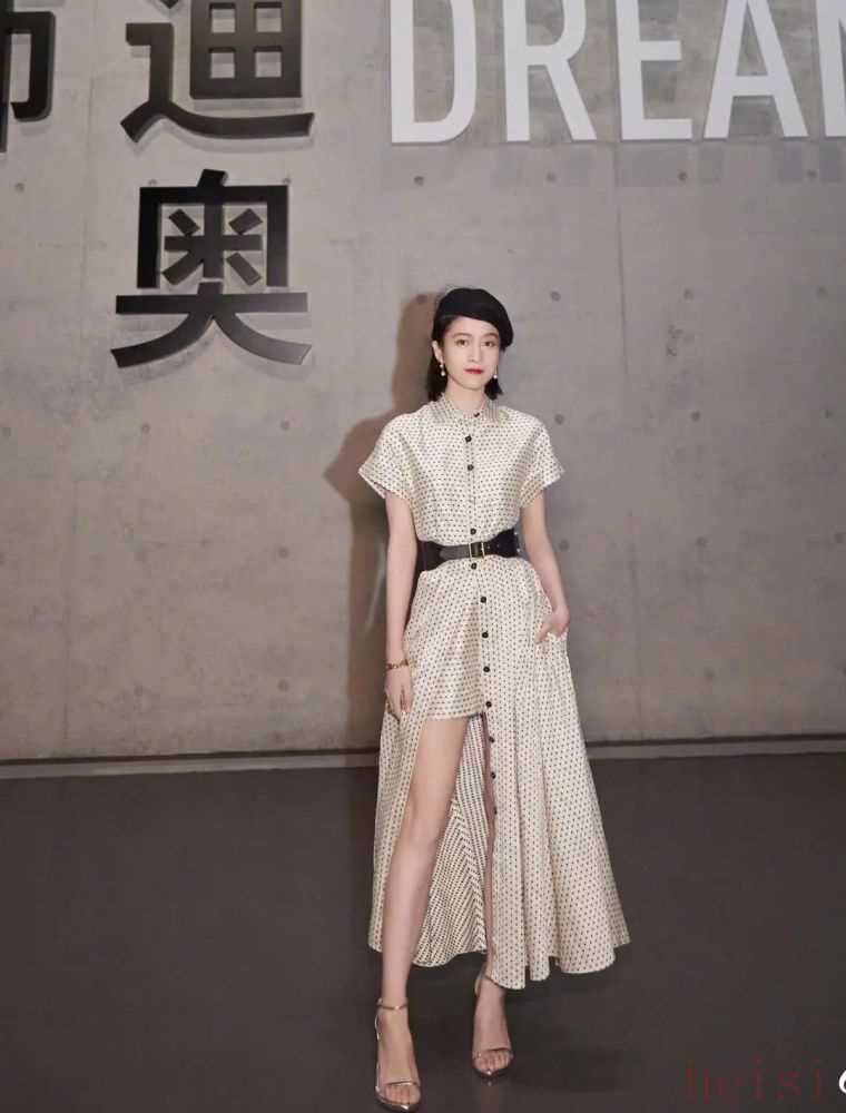 甚至迪奥的2020早秋系列也有本季不可或缺的波点元素,张雪迎这身香槟色的波点长裙搭配同色高跟鞋和珍珠耳环显得优雅,但同时又用了黑色贝雷帽增加一丝帅气活泼感,长短裙叠穿修饰腿型,并且用腰带把腰线勾勒出来,强调了腰线,整体搭配拉高了身高。优雅长裙与活泼波点的碰撞更具少女活力,更符合张雪迎的年龄,若是选择其他图案,可能会略显老气。
