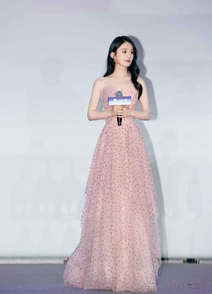 赵丽颖这条粉色波点抹胸纱裙,除了胸前有一个小的装饰外,整体非常简单,干净,用叠层的裁剪突出线条,波点的分布也是有秘密的!波点由裙摆的尾端向腰部逐渐变得密集起来,将人们的视线和焦点吸引到她最细的腰上,并且视觉上也起到一定的收腰的效果。