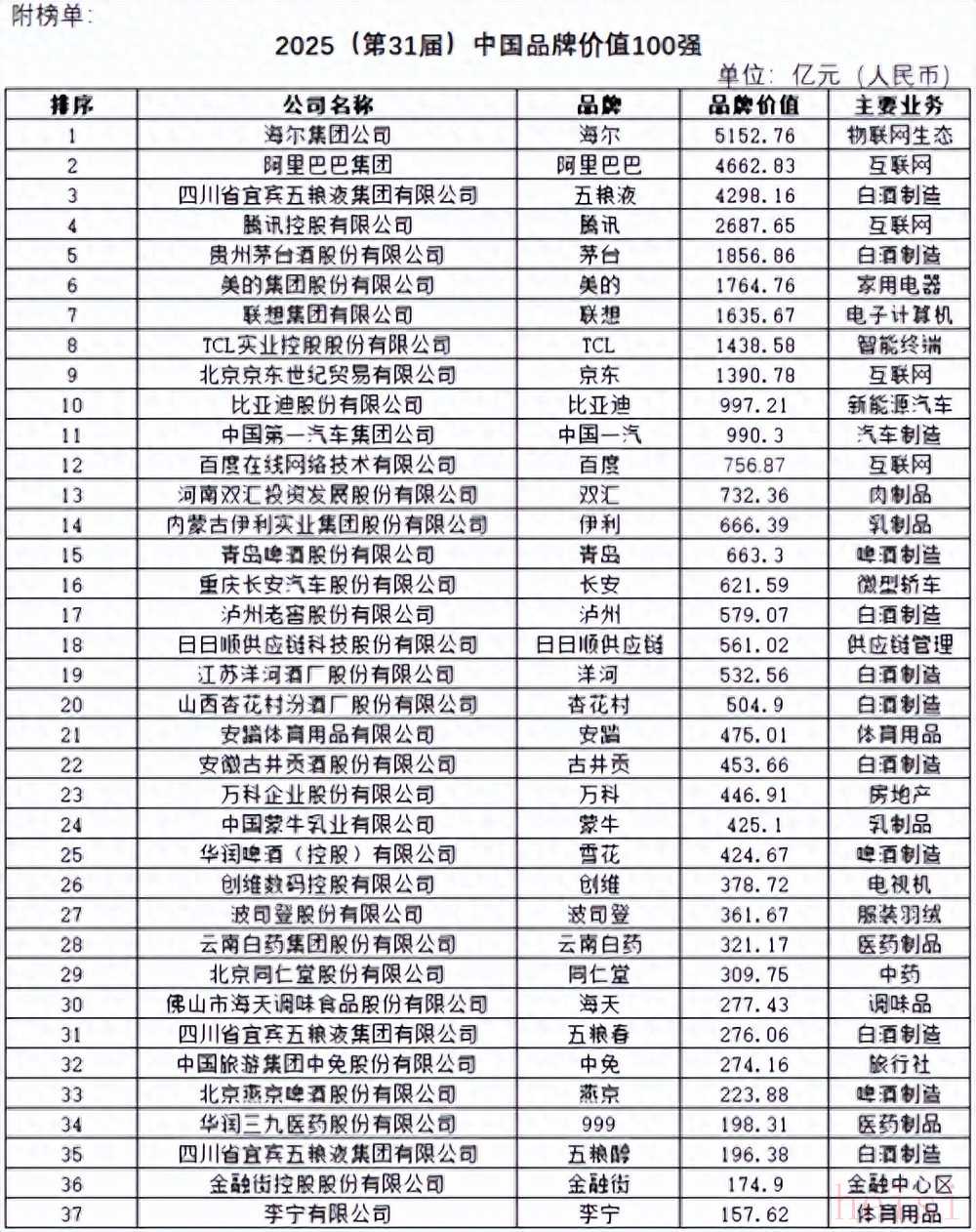 2025(第31届)中国品牌价值100强研究报告日前揭晓,海尔品牌价值5152.76亿,连续24年居首,其后是阿里巴巴4662.83亿、五粮液4298.16亿、腾讯2687.65亿、茅台1856.86亿、美的1764.76亿、联想1635.67亿、TCL1438.58亿。该研究始于1994年,是国内最早也是持续时间最长的关于品牌价值比较的专业研究。该研究在国内最先提出“品牌是最有价值的资产”,目的是推进中国企业创建自主品牌,由北京名牌资产评估有限公司连续31年跟踪进行。今年的研究重点,继续关注2020年新冠疫情5年来对品牌发展的影响。100品牌2019年平均营业收入543.63亿,2024年度平均823.69亿,5年增长51.52%,平均年增长10.3%。但是近5年的增长速度与疫情前3年年均增长19.28%相比,年均增长下降了9.39个百分点。2008年全球金融危机,观察品牌在金融危机以后的发展态势,成为近17年的研究重点。与金融危机前的2007年相比,100品牌平均收入累计增长7.13倍。更为可喜的是,平均营业利润累计增长达到11.54倍,超过收入增长水平4.41个百分点。2024年度收入增长4.44%、营业利润率保持10.9%,品牌依然是最有价值的资产。31年的研究一再证明,市场竞争越激烈,品牌价值越是凸显。1994年80个品牌平均收入19.58亿,而今100品牌31年总增长41.07倍。前20位品牌1994年平均收入49.84亿,2024年平均3523.33亿,增长了69.69倍,更是凸显强者恒强趋势不变。31年前正是中国制造业品牌崛起之初,该研究选取的研究对象都是消费类制造业竞争性品牌。后来陆续增加了18个互联网及服务业品牌,也是为了更好的研究互联网新经济对于传统制造业品牌的影响。研究认为,二十多年前是我国制造业品牌高速发展的黄金阶段,其后是以互联网为首的服务业品牌迅速崛起期。以金融危机前的2007年为坐标,82个制造业品牌平均收入是112.43亿,18个服务业品牌平均只有50.66亿,制造业品牌规模是服务业品牌的2.22倍。到了2024年,制造业品牌平均收入608.76亿,服务业品牌平均收入已经达到1802.82亿,是制造业品牌规模的2.96倍,充分显示了互联网时代的产业发展特征。但研究发现,从2022年开始,服务业的发展已经从过去年度2位数的增长速度回落到1位数。82个制造业品牌在疫情以来最艰难的5年,年均增长达到10.3%,显示我国制造业主导品牌的发展走向依然保持稳健。报告显示,2024年度家电行业的增速最高,平均增长10.32%,其次是白酒品牌增长8.01%。旅游业近几年受疫情影响最大,2023年度旅游业增速达到48.09%,2024年度则是负增长1.59%。客观分析,旅游业2023年度的高速增长是建立在2022年受疫情影响年度减速14.23%的基础之上。但是零售业的下降则是连年不断的,2022年下跌21.21%,2023年下跌24.23%,2024年下跌12.4%,表明实体零售连锁品牌逐步缩减或离场已是大势所趋。在跟踪研究的细分行业中,有6个出现年度负增长,依次是啤酒、粮油肉、旅游业、乳制品、零售业,降幅最大的是与住相关的品牌,2024年度降幅达29%。伴随中国耐用消费品制造业的发展与崛起,2002年以来,海尔品牌价值连续24年居首。近年更是得益于其在生态共建、全球布局、IP矩阵、AI科技等多维度的显著成效。在生态共建方面,海尔入股新时达、汽车之家,持续深化数字经济产业生态建设;在全球布局方面,强化 “本土化研发、本土化制造、本土化营销” 三位一体布局,并携手利物浦、巴黎圣日耳曼等冠军球队,进一步提升全球品牌影响力;海尔构建 KOB、KOE、KOS 三级矩阵,推动流量沉淀为终身用户,转化为生态力量。其中通过与网友交互推出的懒人三筒洗衣机,上市4个月交付量便达10万台;在AI科技方面,推出“AI之眼”系列家电,使家电从“听懂指令、按需执行”升级为“看懂状态、主动服务”。31年来,五粮液品牌价值在白酒行业一直排在第一位。研究认为,品牌价值不是比谁的产品卖价高,利润高,而是产品市场覆盖率高,人们重复消费的频率高。如果仅仅是卖价高,但是由于种种原因而产量受局限,市场假冒很难免。品牌的名称也很重要,酒类产品过去常常以地名作为品牌,如法国“香槟”因为突出的是产地,其品牌发展因此受限。五粮液的名称很符合酒的特质,而且有着丰富的产品线,如五粮春、五粮醇等不同产品档次和清晰的价位区分,能够覆盖更多不同需求的消费群体,因而具有更大的发展空间。报告强调了31年研究一贯坚持的观点:中国人自己创建或在中国市场创立的合资品牌;能够获取相关资料,重点来自公开数据;跟踪研究品牌价值历史轨迹;发现并研究细分的消费新趋势;坚持独立研究独立发布,不追求显赫的国家或中字头旗号,为消费者及海内外社会各界研究中国品牌提供一种参考。100品牌分布在61个大小行业类别中,市场规模从数千亿到几千万,都是贴近百姓生活与消费的行业佼佼者。让更多的与消费者生活密切相关的细分行业品牌进入研究视野,也是该研究秉持的一个观点。与其他品牌价值排行榜不同的是,百个品牌中没有规模显赫的石油石化、电力、铁路、通信等资源垄断性行业。该研究认为,资源垄断性行业规模的大小及分分合合是国家的战略与策略,不完全是市场竞争的结果。